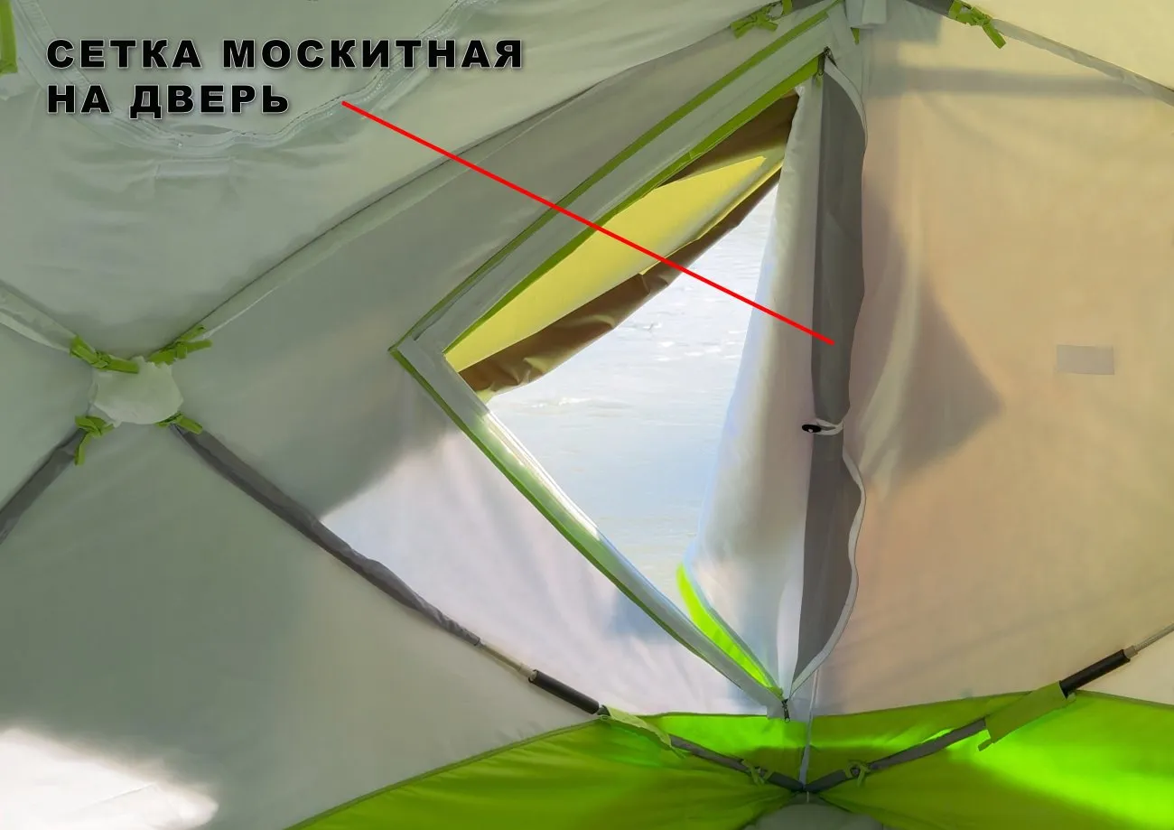 Дверь-сетка является дополнительным внешним элементом палатки. Дверь оснащена собственным замком на молнии №8, клевантом для фиксации раскрытой сетки сбоку дверного проема и системой крепления на «липучках», вшитых по ее внешнему периметру. Дверь-сетка изготовлена из прочной москитной сетки плотностью 60 г/м2 и ткани Оксфорд 240Д. В транспортировочном положении на «липучке» установлена защитная планка, дублирующая ее длину и форму. Защитная планка исключает повреждение ячеек сетки крепежной липучкой при транспортировке. В процессе установки двери-сетки планка снимается и сохраняется для последующего ее демонтажа, если возникнет такая необходимость.