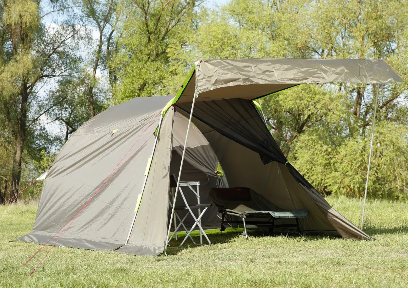 Внутреннее пространство тамбура позволяет разместить в нем походную мебель, например, раскладушку и стол со стульями. Внутри палатки можно застелить утепленный пол и использовать это пространство для ночевки.